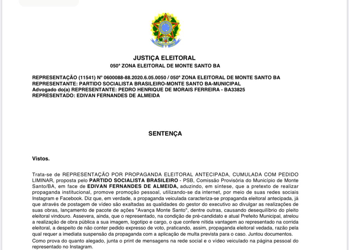 A Justiça Eleitoral, por meio da representação movida pelo Partido Socialista Brasileiro (PSB) de Monte Santo, multou o prefeito de Monte Santo, Edivan Fernandes de Almeida (Vando) por propaganda eleitoral irregular.