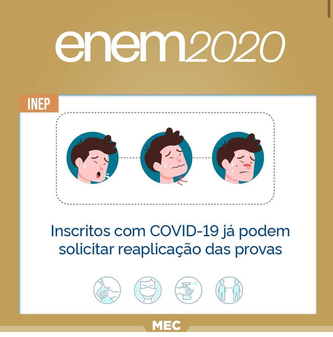 Os inscritos no Exame Nacional do Ensino Médio (ENEM – 2020), que forem portadores do coronavírus e outras doenças prevista nos editais, podem solicitar a reaplicação das provas que acontecem nos dias 17 e 24 de janeiro (exame impresso) e no dia 31 de janeiro e 07 de fevereiro (exame digital), para serem realizadas nos dias 23 e 24 de fevereiro.