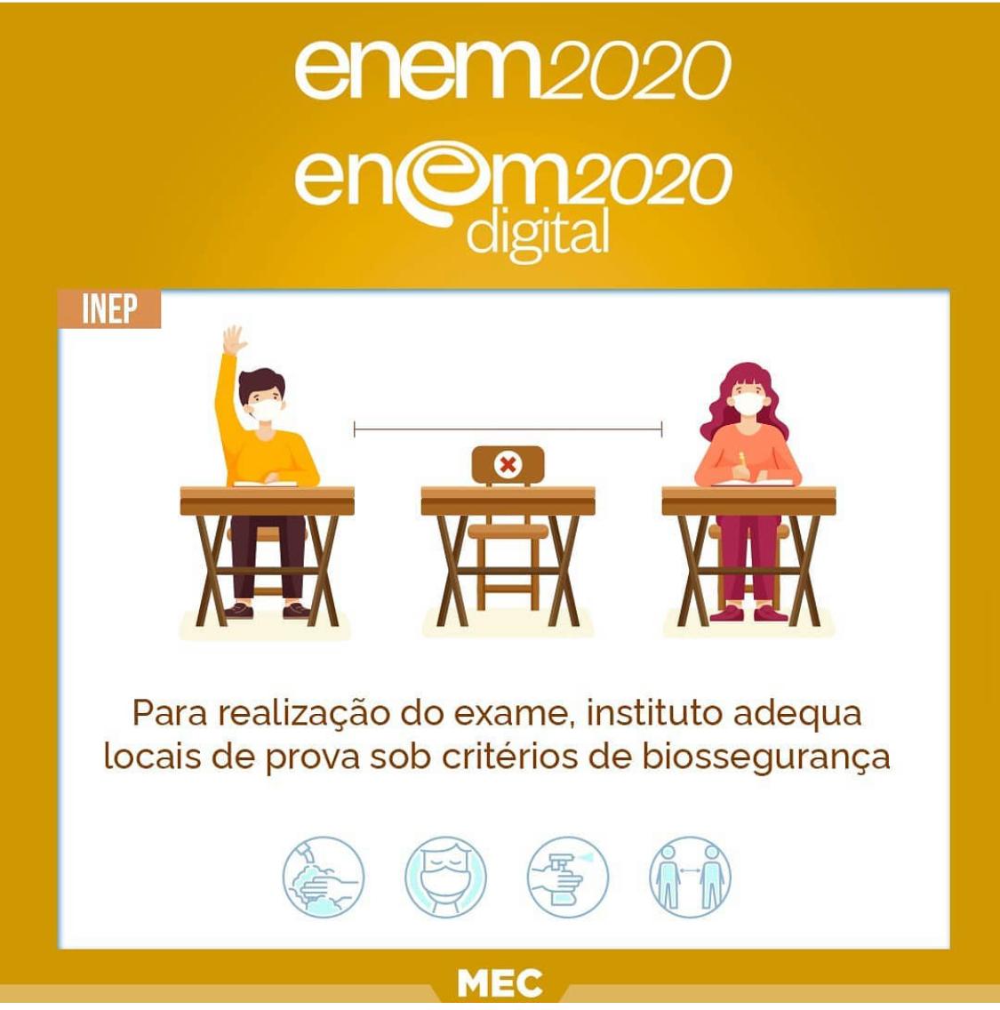 As provas impressas do ENEM 2020, serão aplicadas nos dias 17 e 24 de janeiro e as digitais no dia 31 de janeiro e 07 de fevereiro do decorrente ano. Em decorrência da pandemia e o risco eminente trazido pelo COVID-19, medidas de biossegurança foram adotadas pelo Instituto Nacional de Estudos e Pesquisas Educacionais Anísio Teixeira (Inep) para garantir que os 5.783.357 inscritos possam realizar o Exame Nacional do Ensino Médio.