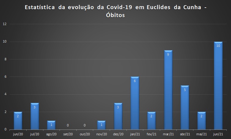 Março havia sido o pior mês dessa pandemia em Euclides da Cunha ao ter o registro de 9 vítimas fatais. Em abril, o número de óbitos caiu quase pela metade (5), e em junho, o total de óbitos registrados foi 2. Agora, em junho, o total de óbitos subiu para 10.