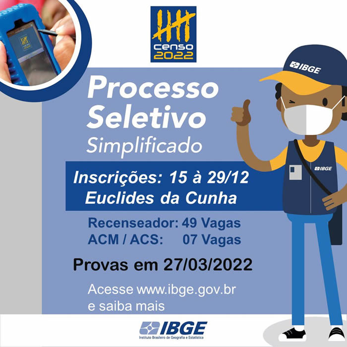 As inscrições estão abertas entre os dias 15 a 29 de dezembro de 2021. As provas serão realizadas em 27 de março de 2022, sendo que o candidato poderá se inscrever tanto para ACM/ACS, quanto para recenseador, pois a prova de recenseador será das 09h às 12h e a de ACM/ACS será das 14h30m às 18h.