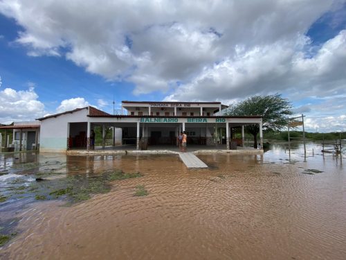 Devido a terceira enchente no Rio Vaza Barris, a Pousada e Balneário Beira Rio acabou ficando llhada, deixando piscina e estacionamento do estabelecimento em baixo da água.