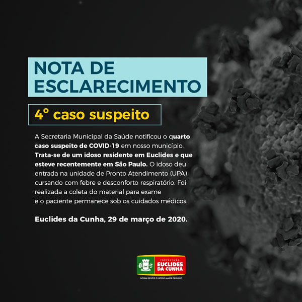 A Secretaria Municipal de Saúde, emitiu uma notificação de um novo caso suspeito de COVID-19 (coronavírus), o quarto caso é um idoso que esteve recentemente em São Paulo, o mesmo deu entrada na unidade de pronto atendimento (UPA) no nosso município, apresentando febre e um desconforto respiratório, de imediato foi realizado uma coleta de material para exame e o idoso foi orientado a manter isolamento domiciliar até sair o resultado do teste laboratorial.