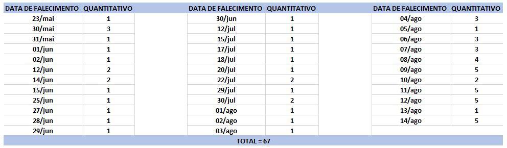 O boletim epidemiológico de hoje contabiliza 67 óbitos que ocorreram em diversas datas, conforme tabela abaixo. A existência de registros tardios e/ou acúmulo de casos deve-se a sobrecarga das equipes de investigação, pois há doenças de notificação compulsória para além da Covid-19. Outro motivo é o aprofundamento das investigações epidemiológicas por parte das vigilâncias municipais e estadual a fim de evitar distorções ou equívocos, como desconsiderar a causa do óbito um traumatismo craniano ou um câncer em estágio terminal, ainda que a pessoa esteja infectada pelo coronavírus.