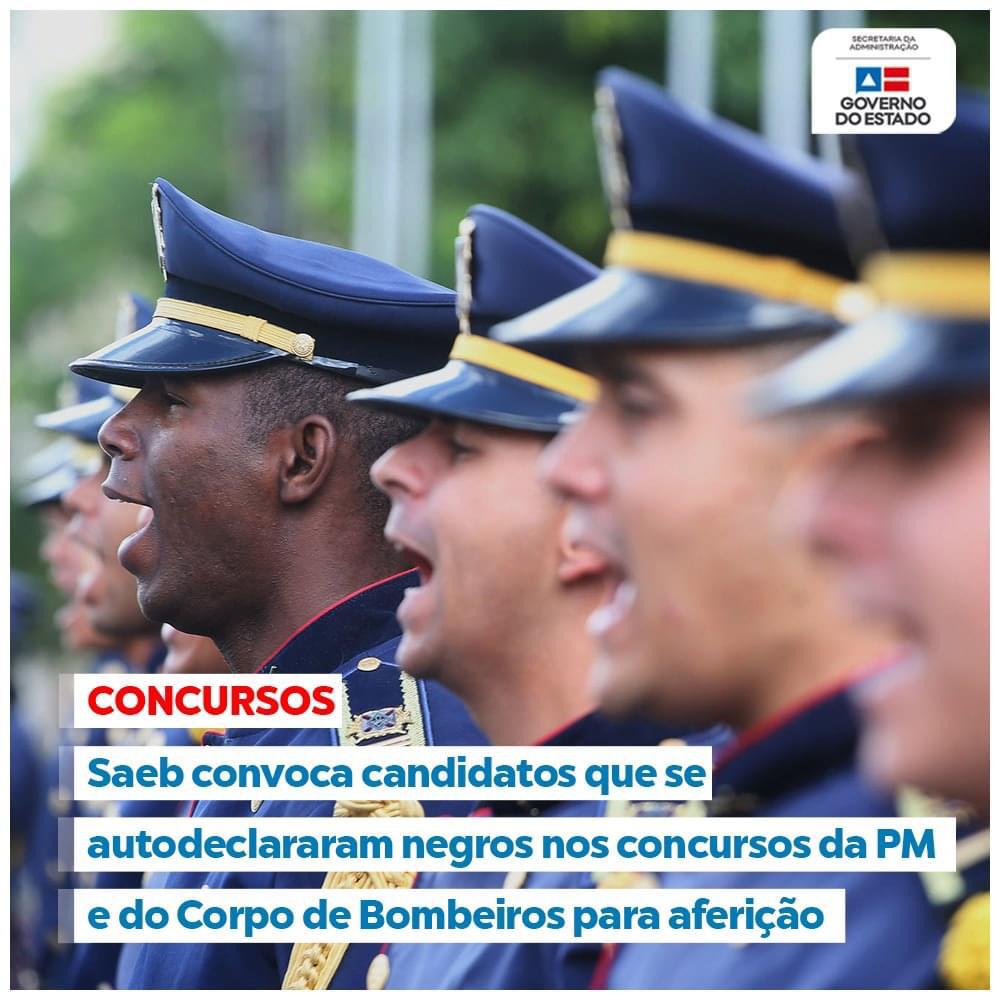 A Secretaria da Administração (Saeb) convoca, nesta sexta-feira (9), para aferição de sua declaração por Comissão de Heteroidentificação, os candidatos que se autodeclararam negros no concurso para Soldado da Polícia Militar e do Corpo de Bombeiros, assim como do concurso para Oficial Médico e Odontólogo da PM.