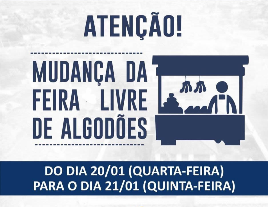 Prefeitura de Quijingue informa que a feira livre do Distrito de Algodões que seria quarta-feira (20), dia do padroeiro São Sebastião, foi transferida para o dia seguinte, dia 21 de janeiro.