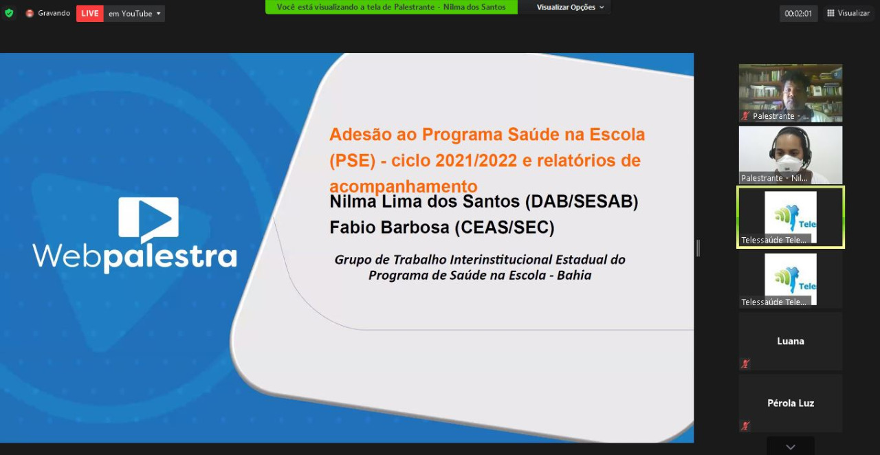 As prefeituras municipais têm até o próximo dia 16 de fevereiro para aderir ao Programa Saúde na Escola. Com o objetivo de orientar e mobilizar os municípios, uma webpalestra na plataforma TelessaúdeBA foi realizada, nesta terça-feira (2), para representantes das gestões municipais da Educação e Saúde, dos Núcleos Territoriais de Educação e profissionais das duas áreas. No encontro virtual, o coordenador de Educação Ambiental e Saúde da Secretaria Estadual da Educação (SEC), Fábio Barbosa, debateu sobre o programa e apresentou suas diretrizes e seus desafios. Em seguida, representando a diretoria de Atenção Básica da Secretaria Estadual da Saúde, a fonoaudióloga Nilma dos Santos ressaltou os programas NutriSus e Crescer Saudável.