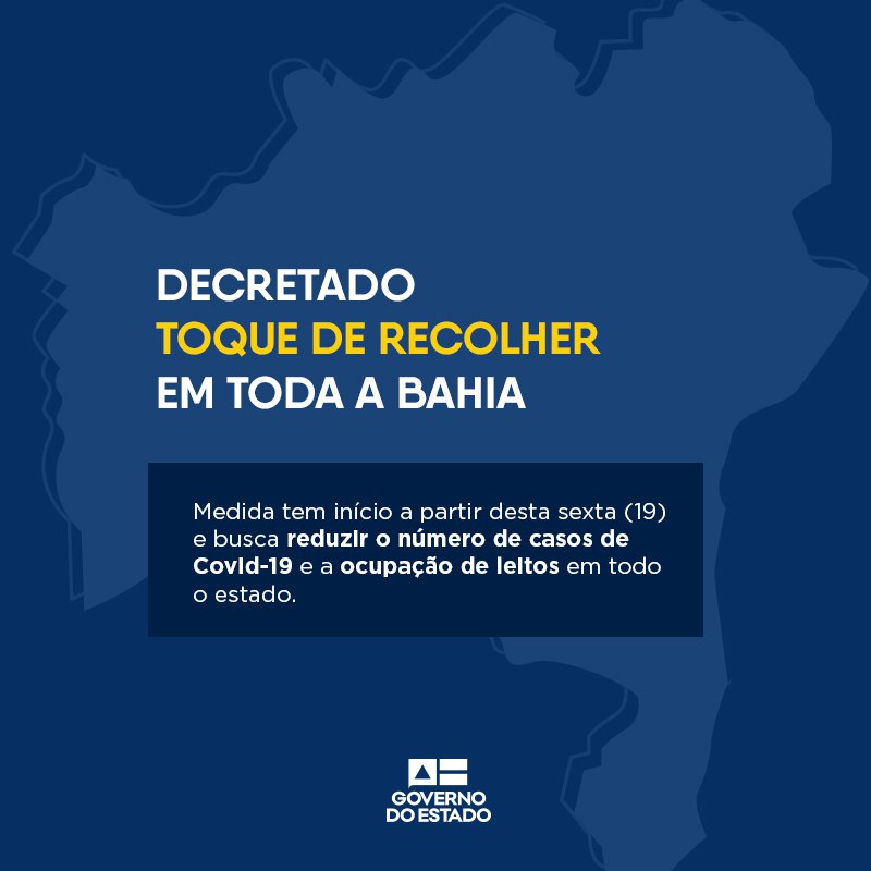 A partir desta sexta-feira (19), ficará restrita a circulação de pessoas nas ruas e o funcionamento de serviços não essenciais após as 22h em grande parte da Bahia, exceto nas regiões oeste, de Irecê e de Jacobina, que apresentam os três menores índices de ocupação de leitos de UTI para Covid-19.