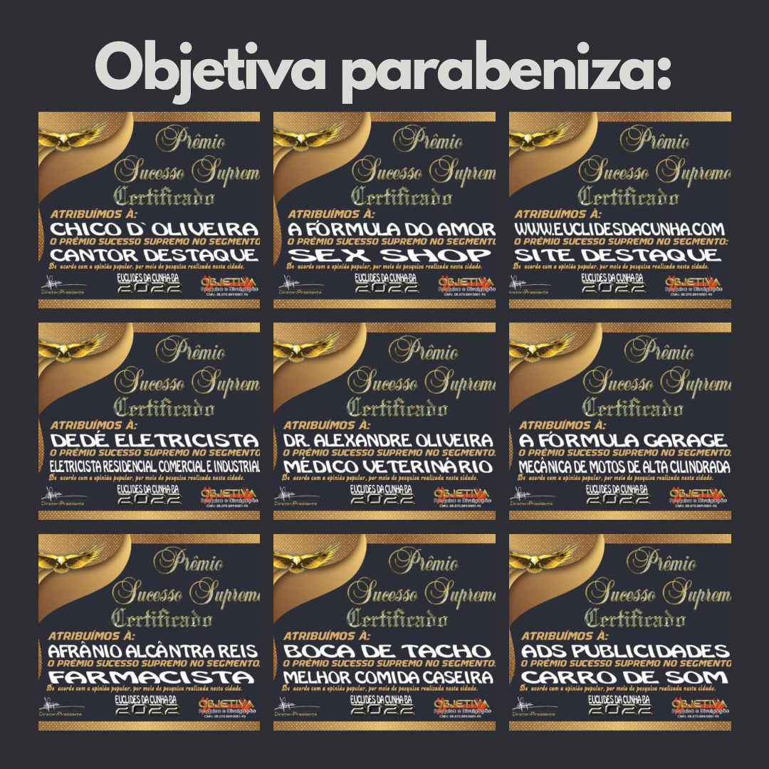 A empresa Objetiva Pesquisa e Divulgação está há muitos anos no mercado, exatamente 15 anos em Euclides da Cunha – BA, realizando o manuseamento de dados de opinião pública, que elegem os profissionais e empresas de destaque no município e região. Um trabalho com a credibilidade que todos já conhecem, na edição do ano de 2022 certifica e premia os seguintes profissionais:
