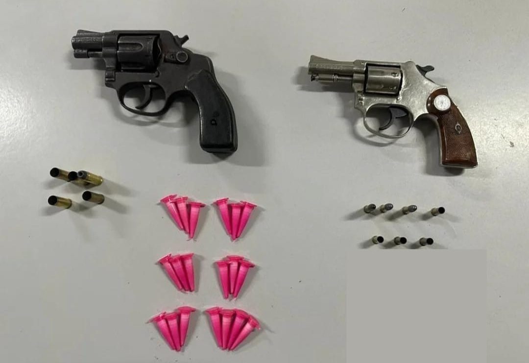 Com os indivíduos, foram encontrados: 01 revólver Rossi, calibre .32; 04 munições deflagradas calibre .32 e 01 intacta; 01 revólver Rossi, calibre .22; 04 munições deflagradas e 03 intactas calibre .22; 19 pinos de substância análoga à cocaína; 01 motocicleta Honda XRE, cor verde; e – 01 moto Honda CG, cor vermelha.