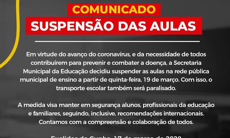 Comunicado da Prefeitura Municipal de Euclides da Cunha na Internet torna pública a suspensão as aulas da rede pública municipal a partir da próxima quinta-feira,…
