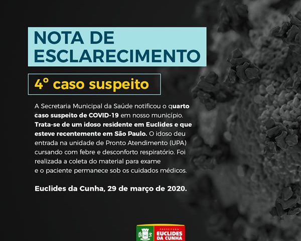 A Secretaria Municipal de Saúde, emitiu uma notificação de um novo caso suspeito de COVID-19 (coronavírus), o quarto caso é um idoso que esteve recentemente…