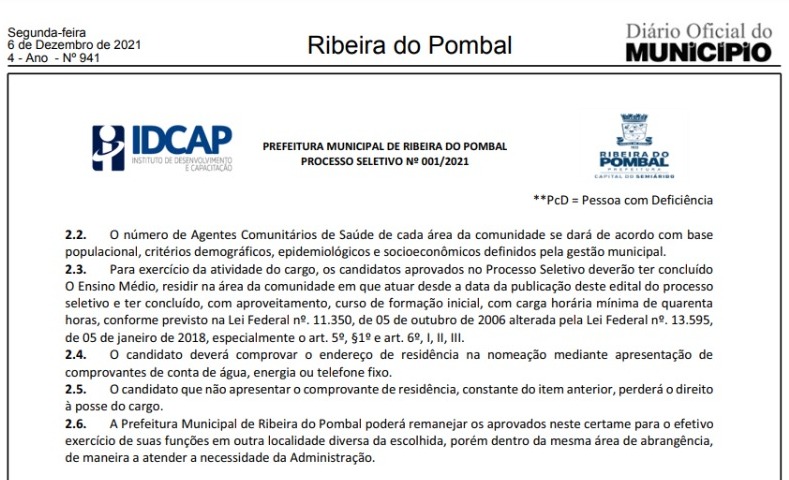 Prefeitura de Ribeira do Pombal abre processo seletivo com 20 vagas