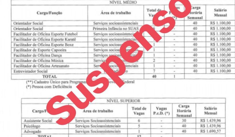 Em comunicado publicado no Diário Oficial, a Prefeitura Municipal de Euclides da Cunha suspende o processo seletivo simplificado com 52 vagas que seriam ocupadas na…