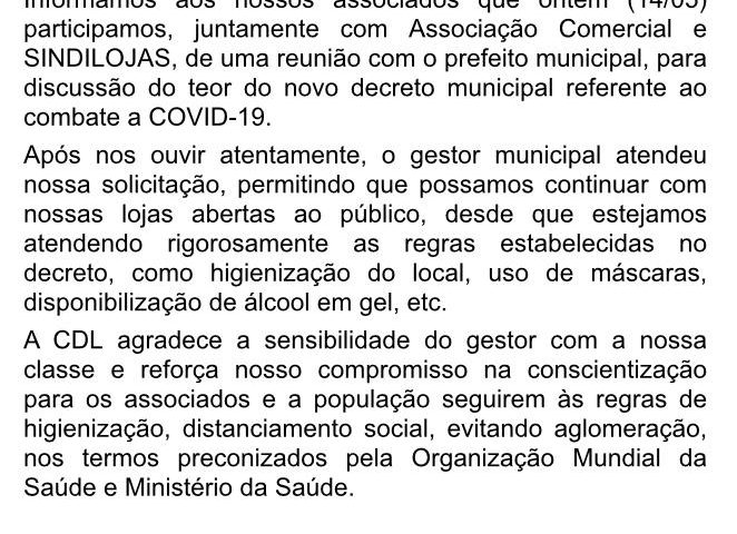 Foi publicado nesta sexta-feira, 08 de maio, o Decreto Municipal nº 1898 que prorroga por 15 dias o fechamento de bares, boates, teatros, parques infantis…