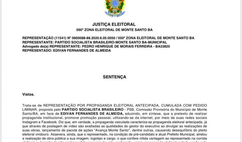 A Justiça Eleitoral, por meio da representação movida pelo Partido Socialista Brasileiro (PSB) de Monte Santo, multou o prefeito de Monte Santo, Edivan Fernandes de…