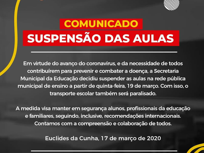 Comunicado da Prefeitura Municipal de Euclides da Cunha na Internet torna pública a suspensão as aulas da rede pública municipal a partir da próxima quinta-feira, dia 19. Com essa medida, o transporte escolar também será paralisado.