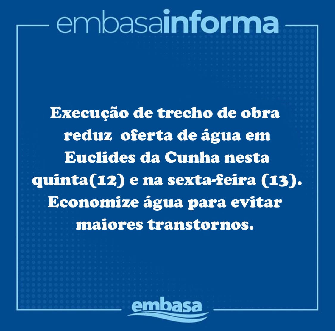 A Embasa informa que será preciso reduzir a oferta de água no município de Euclides da Cunha nesta quinta (12) e na sexta-feira (13) para a realização de serviços de entroncamento de barriletes em um reservatório recém – construído através das obras do Sistema Tucano Noroeste. A redução da oferta de água vai afetar o abastecimento em todo o município, em especial na sexta-feira (13) quando será preciso interromper o fluxo total da água fornecida.