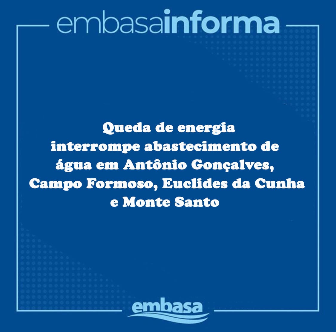 A Embasa informa que será preciso interromper o abastecimento de água no município de Monte Santo na tarde de hoje (10) para a realização de serviços de manutenção em um reservatório de água tratada que atende o município. Os serviços devem durar até o início da noite de domingo (11), com previsão de retomada do fornecimento de água logo em seguida, atendendo a população gradativamente. Moradores cujos imóveis possuem reservação adequada e suficiente poderão sentir menores efeitos da interrupção, mas é recomendável que todos economizem água durante este período.