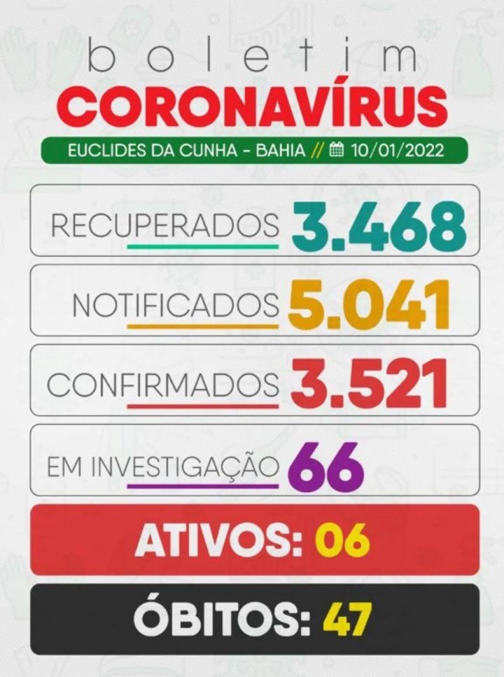 De acordo com o novo boletim, Euclides da Cunha acumula 3.521 casos confirmados, com 3.468 pacientes recuperados. Nesse período o município registrou 47 óbitos, e essa contagem, felizmente, parou há seis meses.