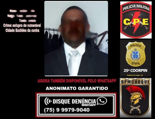 De acordo com a Policia Civil de Euclides da Cunha, o alvo, identificado pelas iniciais A. D. da S., 43 anos, era considerado foragido da Justiça diante da fuga imprimida após estuprar uma criança de 12 anos, fato ocorrido neste ano na cidade de Euclides da Cunha.