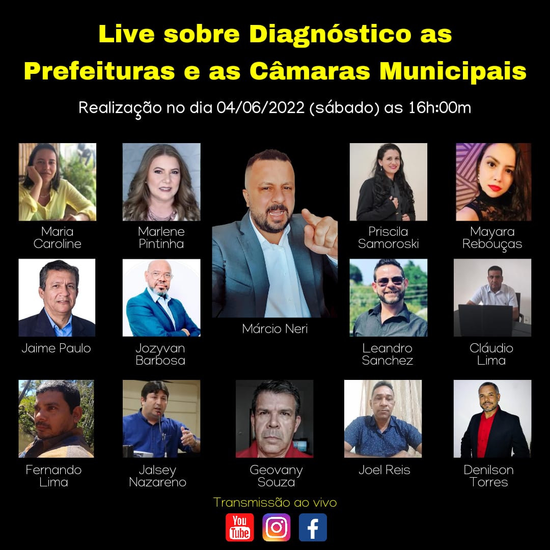Essa LIVE será no formato de bate papo interativo com a apresentação do diagnóstico, acontecerá no dia 04/06/2022 (sábado) as 16h:00m, será transmitida nas redes sociais: Youtube, Instagram e Facebook de todos os participantes, os participantes possuem conhecimento em diversos níveis, cada um escolheu um município para que fizéssemos o diagnóstico da Prefeitura, iremos demonstrar que esse diagnóstico servirá como instrumento de gestão e/ou instrumento de fiscalização.