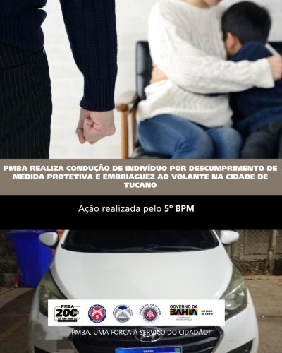 Um homem foi conduzido à delegacia na quinta-feira (12) após ser flagrado descumprindo medida protetiva e dirigindo sob efeito de álcool no povoado Cajueiro, zona rural de Tucano. A ocorrência foi registrada por policiais do 5º Batalhão da Polícia Militar da Bahia após denúncia de ameaças contra familiares.