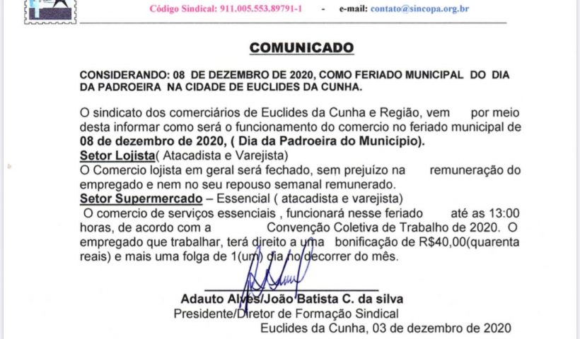 O funcionamento dos estabelecimentos comerciais de Euclides da Cunha durante o feriado municipal