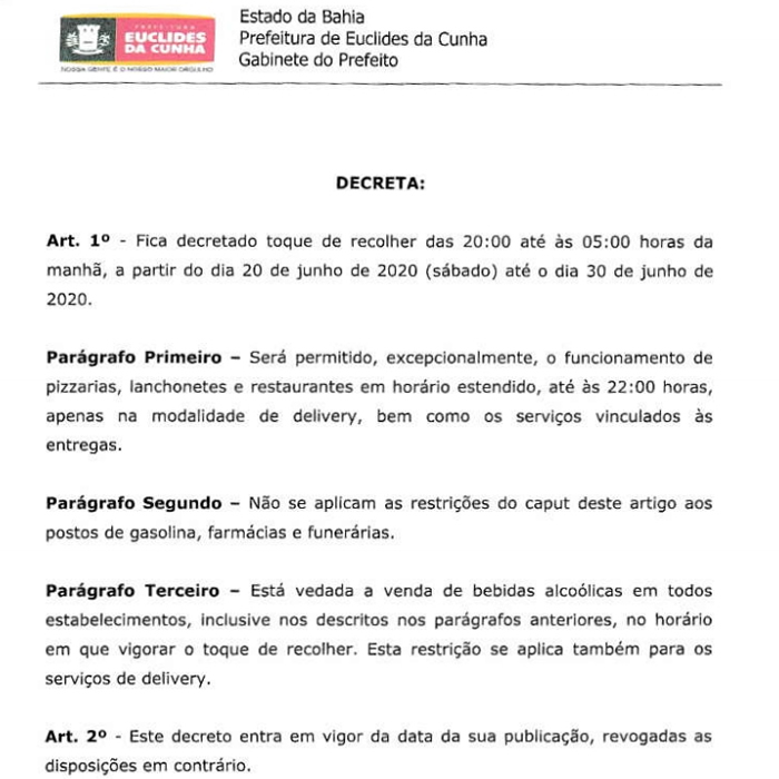 Depois do município de Quijingue, Bahia, Euclides da Cunha terá seu toque de recolher. É o que especifica o novo Decreto Municipal de Euclides da Cunha nº 1944, desta sexta-feira, 19.