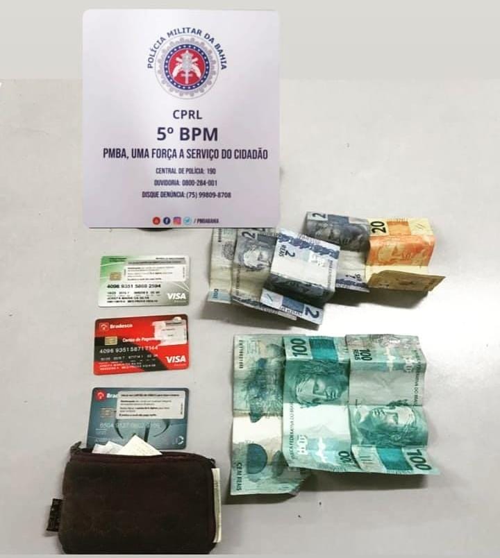 De acordo com a PM, com o suspeito foram apreendidos valores em espécie e cartões de crédito e débito que teriam sido subtraídos de uma residência neste domingo.