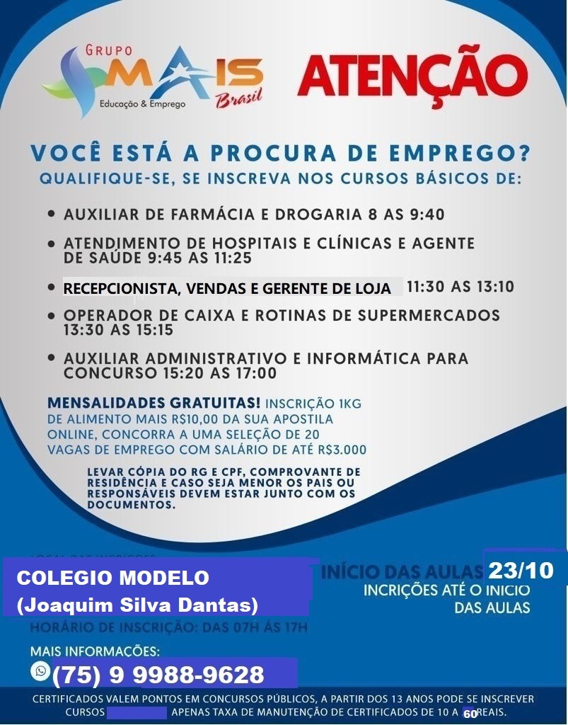 Reconhecida com uma das empresas que mais coloca alunos no mercado de trabalho a MAIS BRASIL traz diversos cursos de capacitação profissional para Euclides da Cunha , no Colégio Modelo Joaquim Silva Dantas, com aulas somente aos sábados, os interessados não pagarão mensalidade e somente a taxa de certificados que tem o valor entre R$ 10 e $ 50 e garantem seu certificado de 40h