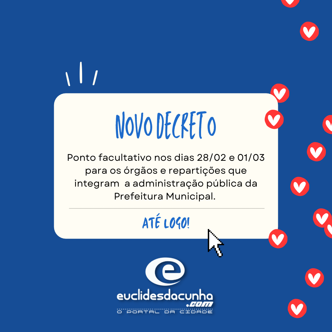 Decreto nº 469/2022 publicado no diário oficial pela prefeitura municipal de Euclides da Cunha – BA, torna explicitado que na segunda-feira (28/02) e na terça-feira (01/03) será ponto facultativo em todos os setores da administração pública do município.