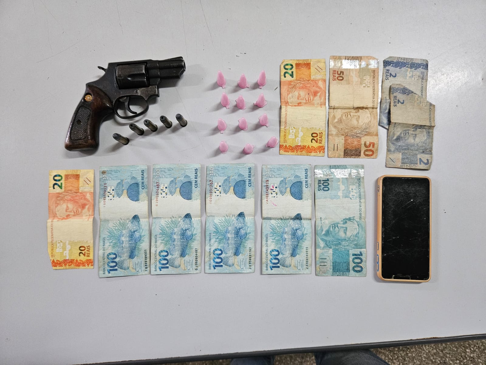 Sabendo das informações e características para identificar o suspeito, uma Guarnição dirigiu-se ao local e conseguiram pegar em flagrante, pois o suspeito tinha em sua posse um revolver Taurus .38 com numeração com cinco munições prontas para uso, 12 pinos de cocaína, R$ 594,00 em espécie e um celular Samsung.